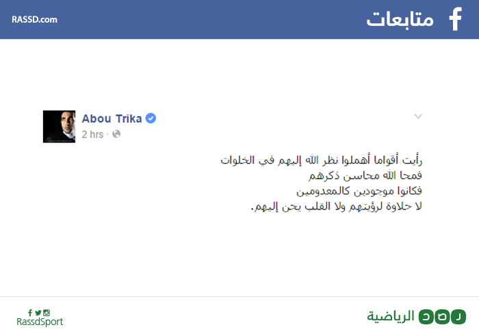 وكتب محمد أبوتريكة عبر صفحته الرسمية على موقع التواصل الاجتماعي “فيس بوك”: “رأيت أقواما أهملوا نظر الله إليهم في الخلوات فمحا الله محاسن ذكرهم، فكانوا موجودين كالمعدومين لا حلاوة لرؤيتهم ولا القلب يحن إليهم”.
