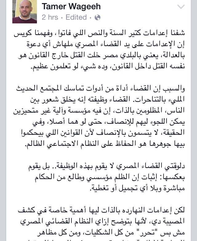 قال تامر وجيه، الناشط اليساري السابق، بالمبادرة المصرية للحقوق الشخصية، إن أحكام الإعدام التي صدرت اليوم، بحق الرئيس محمد مرسي وقيادات الإخوان، هي جزء من محاكمة ثورة يناير.