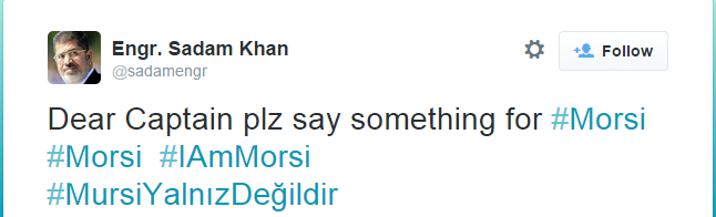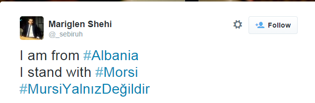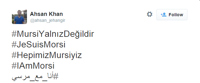 دشن نشطاء أتراك هاشتاج بعنوان  (Mursi Yalnız Değildir– مرسي لست وحدك)، وقد تصدر قائمة أكثر هاشتاج انتشارًا عالميا،  فيما صعد هاشتاج (#morsi) آخر تم إطلاقه إلى المركز الرابع عالميًا في نفس القائمة.