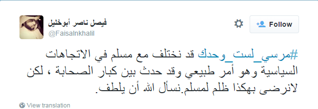 ومن الخليج قال فيصل ناصر أبوخليل “قد نختلف مع مسلم في الاتجاهات السياسية وهو أمر طبيعي وقد حدث بين كبار الصحابة ، لكن لانرضى بهكذا ظلم لمسلم.نسأل الله أن يلطف”.