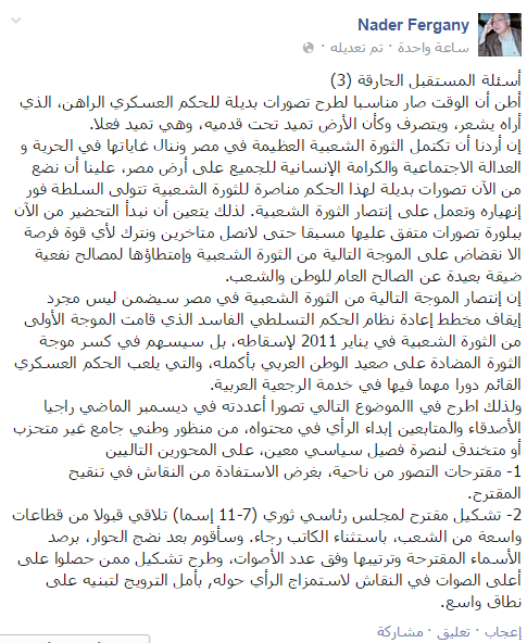 وأضاف “إن أردنا أن تكتمل الثورة الشعبية العظيمة في مصر وننال غاياتها في الحرية والعدالة الاجتماعية والكرامة الإنسانية للجميع على أرض مصر، علينا أن نضع من الآن تصورات بديلة لهذا الحكم مناصرة للثورة الشعبية تتولى السلطة فور إنهياره وتعمل على إنتصار الثورة الشعبية”.