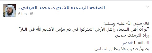 وقال العريفي، في منشور عبر صفحته الرسمية على موقع “فيس بوك”: “قال رسول الله صلى الله عليه وسلم لو أنّ أهل السماء وأهل الأرض اشتركوا في دم مؤمن لأكبهم الله في النار”.