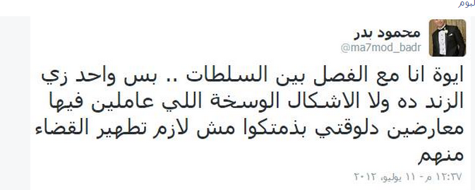 قال “بدر”، “أيوه أنا مع الفصل بين السلطات، بس واحد زي الزند ده ولا الأشكال الوسخة اللي عاملين فيها معارضين بذمتكم مش لازم تطهير القضاء منهم؟”.