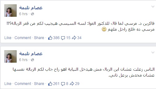 وأَضاف قائلا: “د.مرسي لما قال للدكتور العوا: لسه السيسي هيجيب لكم من قعر الزبالة؟!! مرسي ده طلع راجل ملهم”.