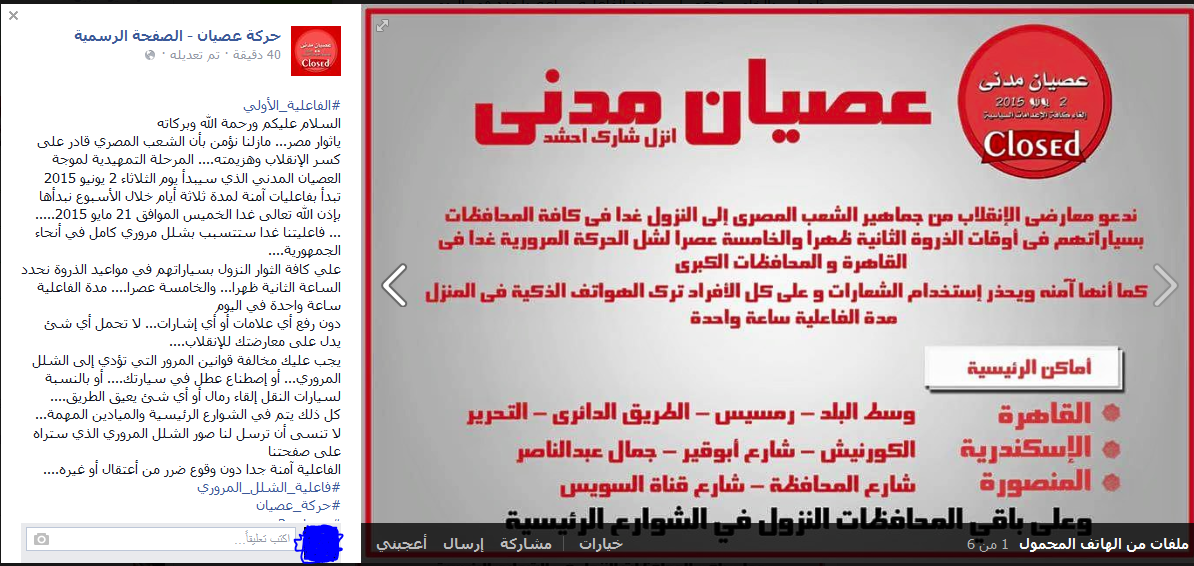 وقالت الحركة في بيان عبر صفحتها بموقع “فيس بوك”: “يا ثوار مصر.. ما زلنا نؤمن بأن الشعب المصري قادر على كسر الانقلاب وهزيمته.. المرحلة التمهيدية لموجة العصيان المدني الذي سيبدأ يوم الثلاثاء 2 يونيو 2015 تبدأ بفاعليات آمنة لمدة ثلاثة أيام خلال الأسبوع نبدأها بإذن الله تعالى غدا الخميس الموافق 21 مايو 2015”.