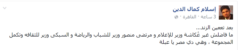 وسخر اسلام كمال الدين، أحد النشطاء، قائلا إن المرحلة تحتاج إلى بعض الوجوه الجديدة والثورية بعد تعيين وزير العدل.