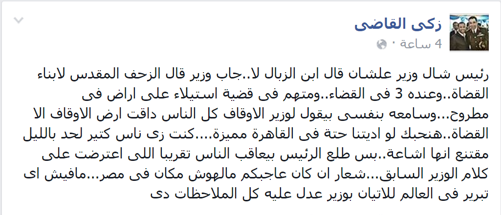 ونشر زكي القاضي، عضو لجنة الشباب والمسئول الإعلامي بحملة عبد الفتاح السيسي وعضو مؤسس بحركة تمرد،، قائلا “رئيس شال وزير علشان قال ابن الزبال لا، جاب وزير قال الزحف المقدس لأبناء القضاة، وعنده 3 في القضاء، ومتهم في قضية استيلاء على أراض في مطروح، وسامعه بنفسي بيقول لوزير الاوقاف كل الناس داقت أرض الأوقاف إلا القضاة، هنحبك لو أديتنا حتة في القاهرة مميزة”