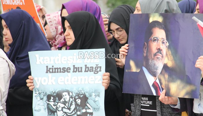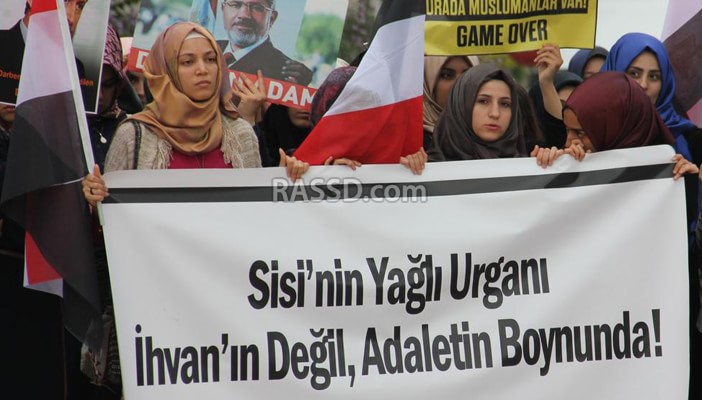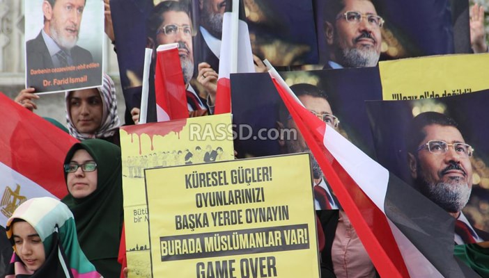 وردد المشاركون في التظاهرة عددا من الهتافات المناوئة لعبد الفتاح السيسي، قائد الانقلاب العسكري، كما علت أصواتهم بالهتافات المؤيدة لـ”مرسي”، حاملين لافتات كتبوا عليها عبارات مؤيدة لمرسي وجماعة الإخوان، ومنها: “نحن مع الإخوان المسلمين ضد الانقلاب في مصر”، و”تركيا معك يا مرسي”.