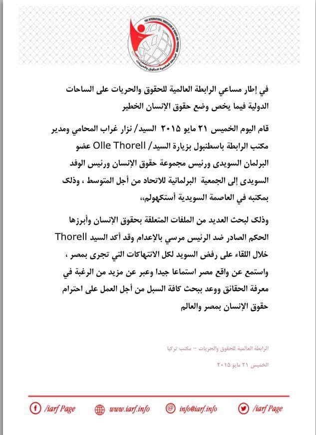 التقى المحامي نزار غراب، مدير مكتب الرابطة العالمية للحقوق والحريات في إسطنبول، أولي ثوريل، عضو البرلمان السويدي ورئيس مجموعة حقوق الإنسان، ورئيس الوفد السويدي إلى الجمعية البرلمانية للاتحاد من أجل المتوسط، في مكتبه في العاصمة السويدية أستكهولم، الخميس، في إطار مساعي الرابطة في فضح الانتهاكات الحقوقية في مصر.