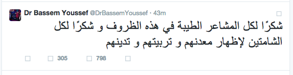 شكر الإعلامي الساخر باسم يوسف كل المشاعر الطيبة التي واسته بعد وفاة والده في حادث اصطدام سيارة.