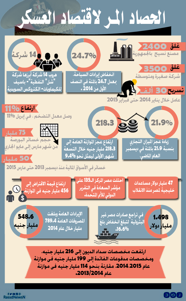 رغم وعود عبد الفتاح السيسي، قائد الانقلاب، بأن مصر ستشهد تنمية كبرى، فإن المشهد الاقتصادي المصري يعاني الأمرين منذ الثالث من يوليو 2013، فكانت محصلة كل هذا معدلات بطالة مرتفعة بين الشباب وعجز قياسي في الموازنة، في ظل مساعدات خارجية لا يعرف مصادر صرفها.