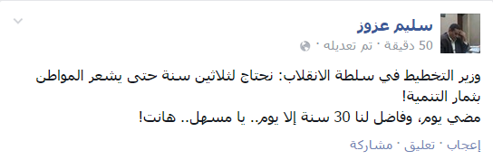 وقال الكاتب الصحفي، سليم عزوز: “وزير التخطيط في سلطة الانقلاب: نحتاج لثلاثين سنة حتى يشعر المواطن بثمار التنمية!“.