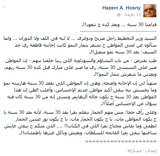 وتابع “ساخرًا”، “متهيألى إن الإجابة واضحة، وهى إن المواطن اللي يقعد 30 سنة هاريينه نمو وما يحسش بيه يبقى أكيد مواطن عديم الإحساس، وأغلب الظن إن هذا المواطن بعد 30 سنة ح يكون جاله ألزهايمر ونسى إنه من 30 سنة كان فيه سؤال عن الإحساس أصلاً!!”.