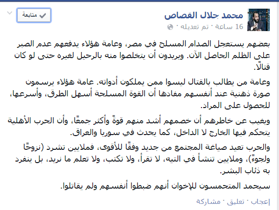 وقال- عبر منشور له على موقع التواصل الاجتماعي “فيس بوك”- “بعضهم يستعجل الصدام المسلح في مصر، وعامة هؤلاء يدفعهم عدم الصبر على الظلم الحاصل الآن، ويريدون أن يتخلصوا منه بالرحيل لغيره حتى لو كان قتالًا”.