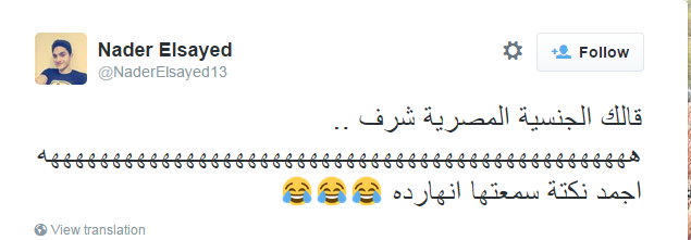 وسخر Nader Elsayed، حيث قال “قالك الجنسية المصرية شرف ..ههههههههههههههههههههههههههههههههههههههههههههههههه، أجمد نكتة سمعتها انهارده“.