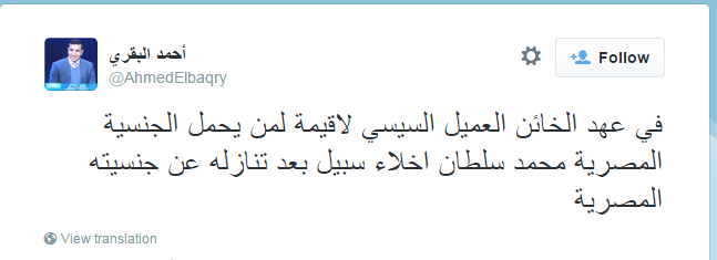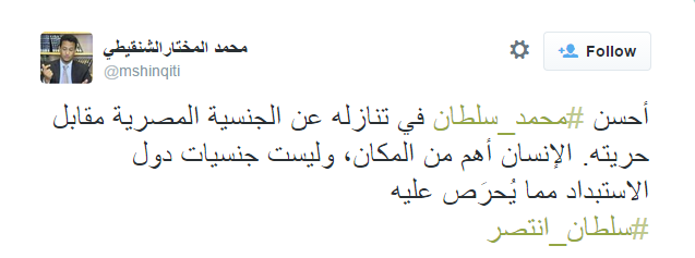 واعتبر محمد المختارالشنقيطي أن “سلطان” أحسن فى تنازله عن الجنسية المصرية مقابل حريته، مضيفا “الإنسان أهم من المكان، وليست جنسيات دول الاستبداد مما يُحرَص عليه”.
