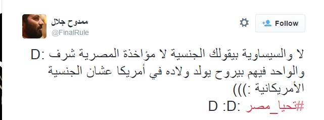 وعلق ممدوح جلال ساخرا “لا والسيساوية بيقولك الجنسية لا مؤاخذة المصرية شرف 😀 والواحد فيهم بيروح يولد ولاده في أمريكا عشان الجنسية الأمريكانية  “.