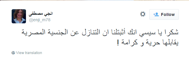 وقالت أنجي مصطفىشكرا يا سيسي انك أثبتلنا ان التنازل عن الجنسية المصرية يقابلها حرية و كرامة !“.