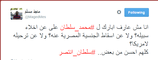 يقول ماجدْ مِسلَّمْأنا مش عارف ابارك لمحمدسلطان على عن اخلاء سبيله؟ ولا عن اسقاط الجنسية المصرية عنه؟ ولا عن ترحيله لامريكا؟كلهم احسن من بعض”.