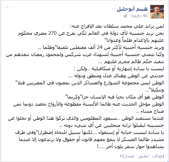 وقال- عبر منشور له على موقع التواصل الاجتماعي “فيس بوك”- “نحن نريد جنسية لأي دولة في العالم لكي نفرج عن 270 مصري محكوم عليهم بالإعدام ظلماً وعدوانا.