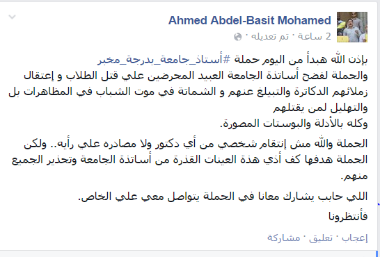 وقال- عبر منشور له على موقع التواصل الاجتماعي “فيس بوك”؛  “حملة لفضح أساتذة الجامعة العبيد، المحرضون على قتل الطلاب وإعتقال زملائهم الدكاترة والتبيلغ عنهم والشماتة في موت الشباب في المظاهرات بل والتهليل لمن يقتلهم، وكله بالأدلة والبوستات المصورة”.