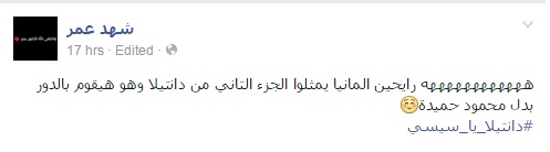 فيما قالت شهد عمر:” ههههههههههههه رايحين المانيا يمثلوا الجزء التاني من دانتيلا وهو هيقوم بالدور بدل محمود حميدة☺”.