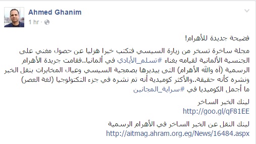 وكتب غانم، في منشور له عبر صفحته على موقع التواصل الاجتماعي “فيس بوك”: “مجلة ساخرة تسخر من زيارة السيسي، فتكتب خبرا هزليا عن حصول مغنٍ على الجنسية الألمانية لقيامه بغناء (‫تسلم الأيادي) في ألمانيا، فقامت جريدة الأهرام الرسمية (آه والله الأهرام) التي يديرها بصمجية السيسي وعيال المخابرات بنقل الخبر ونشره كأنه حقيقة”.