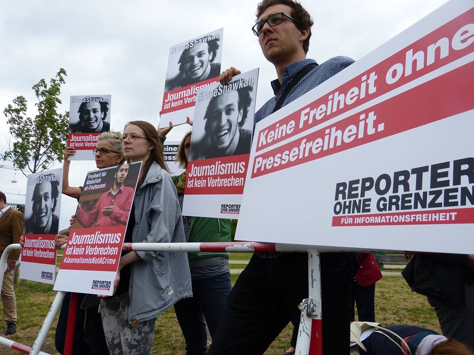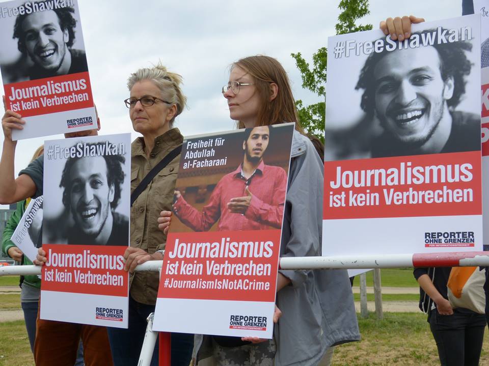 نظم صحفيون ألمان منتمون لمنظمة “مراسلون بلا حدود”، تظاهرة احتجاجية اليوم بألمانيا، بالتزامن مع انعقاد المؤتمر الصحفي الذي جمع بين عبد الفتاح السيسي قائد الانقلاب، والمستشارة الألمانية أنجيلا ميركل، للمطالبة بالإفراج عن الصحفيين المعتقلين.