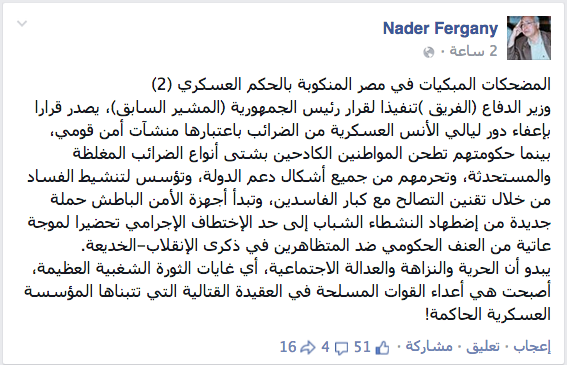 وأضاف فرجاني في منشور له على موقع التواصل الاجتماعي فيس بوك:”أنه في وقت إعفاء المؤسسات العسكرية من الضرائب ، فإن الحكومة تطحن المواطنين الكادحين بشتى أنواع الضرائب المغلظة والمستحدثة وتحرمهم من جميع أشكال دعم الدولة، وتؤسس لتنشيط الفساد من خلال تقنين التصالح مع كبار الفاسدين”.