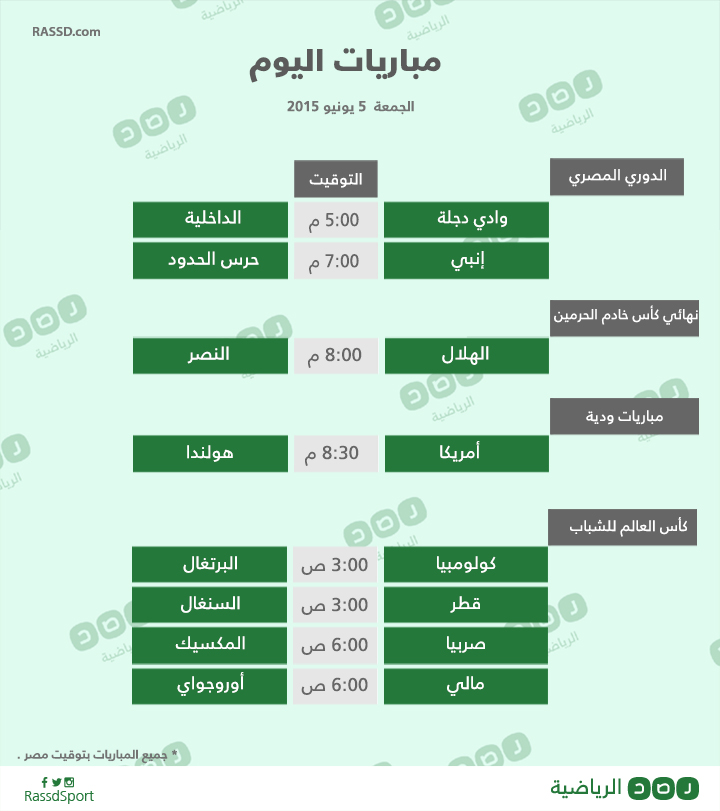 نعرض لكم أبرز مباريات اليوم الجمعة 5 يونيو، حيث تلعب مباراتان بالدوري المصري، وأخرى ودية، و مباراة مرتقبة على المستوى العربي والخليجي بالأخص في نهائي كأس خادم الحرمين الشريفين.
