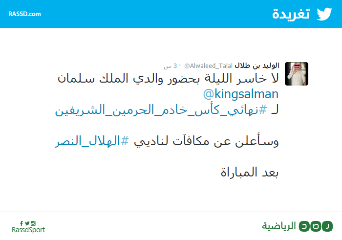 وقال الوليد، عبرحسابه على موقع تويتر: “لا خاسر الليلة بحضور والدي الملك سلمان لنهائي كأس خادم الحرمين الشريفين وسأعلن عن مكافآت لناديي الهلال والنصر”.