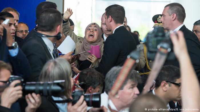 وقفت الناشطة فجر العادلي، الطالبة بكلية الطب والتي استطاعت دخول المؤتمر الصحافي، لقائد الانقلاب عبد الفتاح السيسي، مع المستشارة الألمانية، لتوصل صوت المعارضين في الخارج والداخل، وتهتف في وجه السيسي بسقوط حكم العسكر، وضد المجازر التي ارتكبها السيسي بحق المصريين.