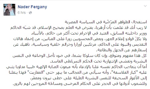 وكتب “فرجاني”، منشورا عبر صفحته على “فيس بوك” تحت عنوان “استفحال الظواهر المرَضَية في السياسة المصرية” قال فيه: “لا ريب أنك قد علمت بأن أزهريا، يفترض فيه العلم بصحيح الإسلام، قد شبّه الحاكم ووزير داخليته السابق، العتيد في الإجرام تحت أكثر من حاكم، بالأنبياء”.