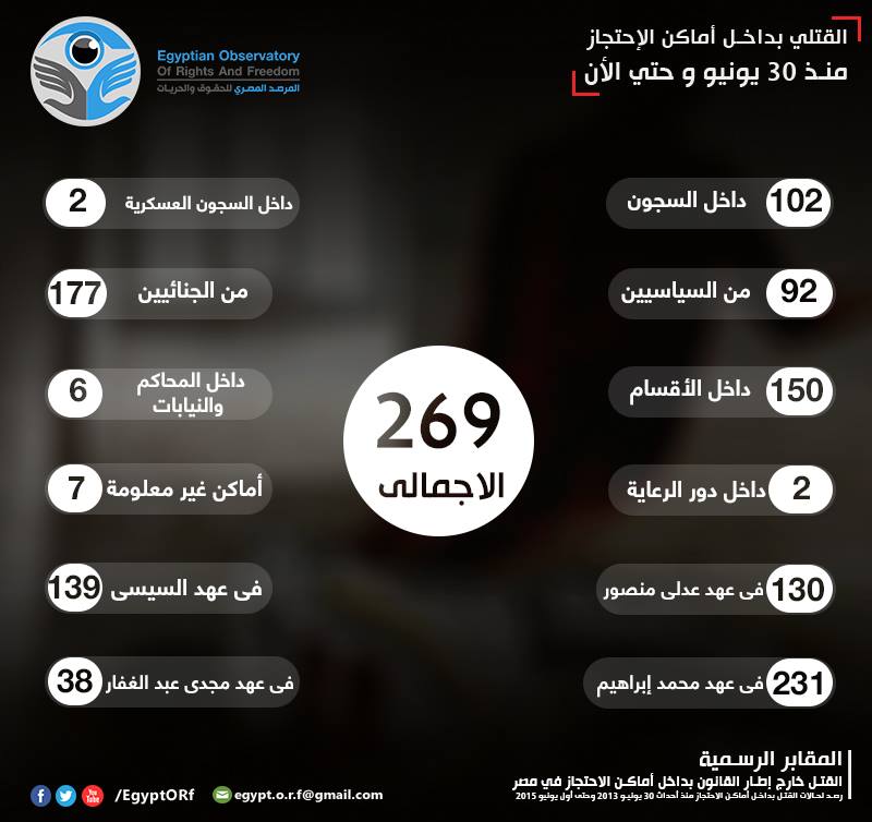 - القتلى بداخل أماكن الاحتجاز منذ 30 يونيو 2013 وحتي الان :269 حالة.