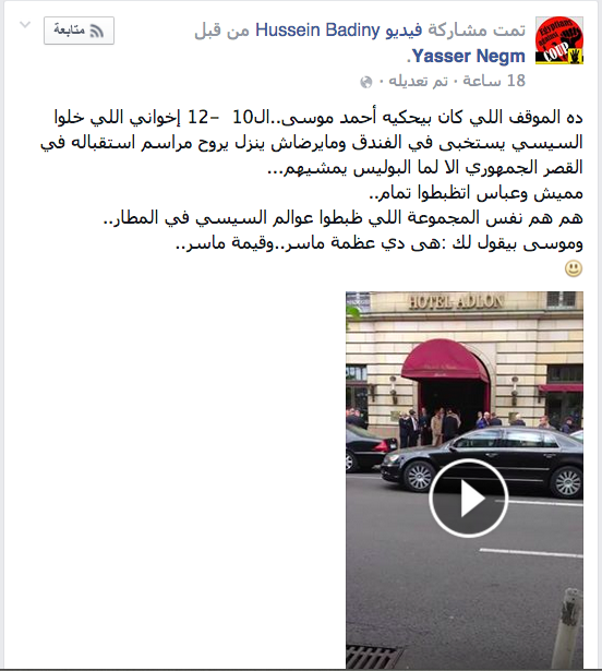 فيما قال أحمد موسى، إنه تم تغيير خط سير موكب قائد الانقلاب العسكري عبدالفتاح السيسي في برلين؛ بسبب اجراءات أمنية، مشيرًا إلى أن طائرة الرئيس وصلت قبل موعدها كعملية تمويهية.
