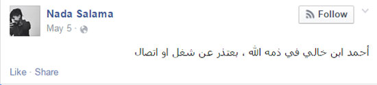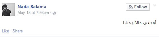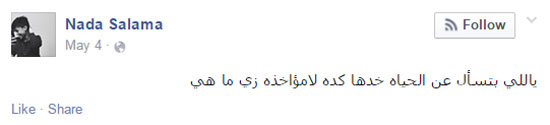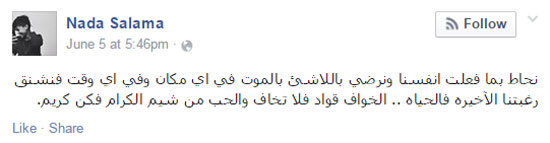 آخر ما سطرته “سلامة” -عبر حسابها على “فيس بوك”، فى الخامس من شهر مايو الجاري- كانت هذه العبارة: “نحاط بما فعلت أنفسنا ونرضى باللاشيء بالموت في أي مكان وفي أي وقت فنشنق رغبتنا الأخيرة في الحياة.. الخواف قواد فلا تخاف والحب من شيم الكرام فكن كريم”.