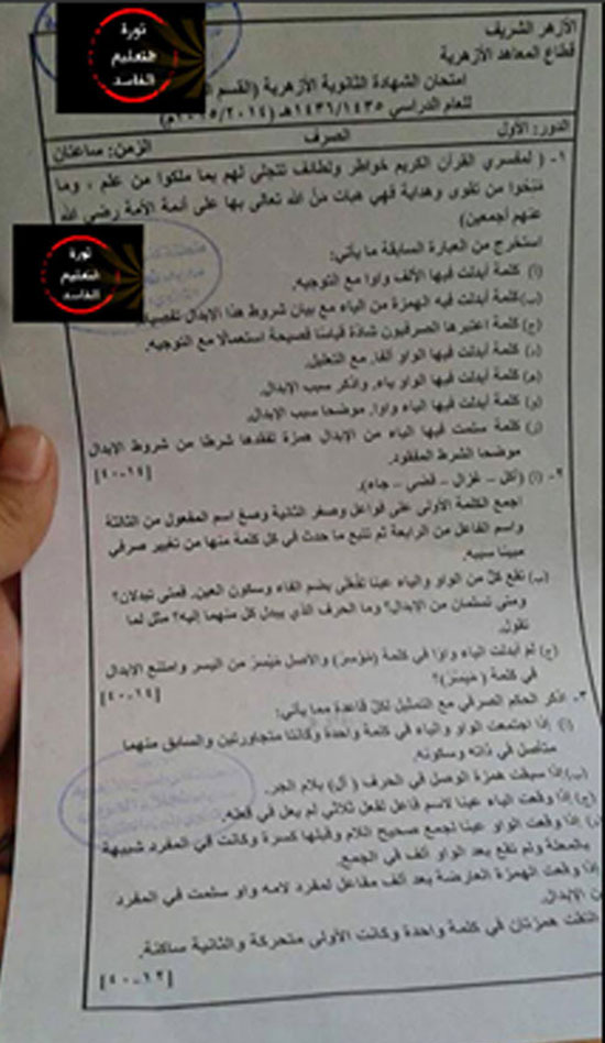 تداول رواد مواقع التواصل الاجتماعي “فيس بوك” والتدوينات القصيرة “تويتر”، ورقة أسئلة لامتحان الصرف للشهادة الثانوية الأزهرية للقسم العلمي 2015 قبل مرور نصف الوقت، فور بدء الامتحان والمقرر له ساعتان.
