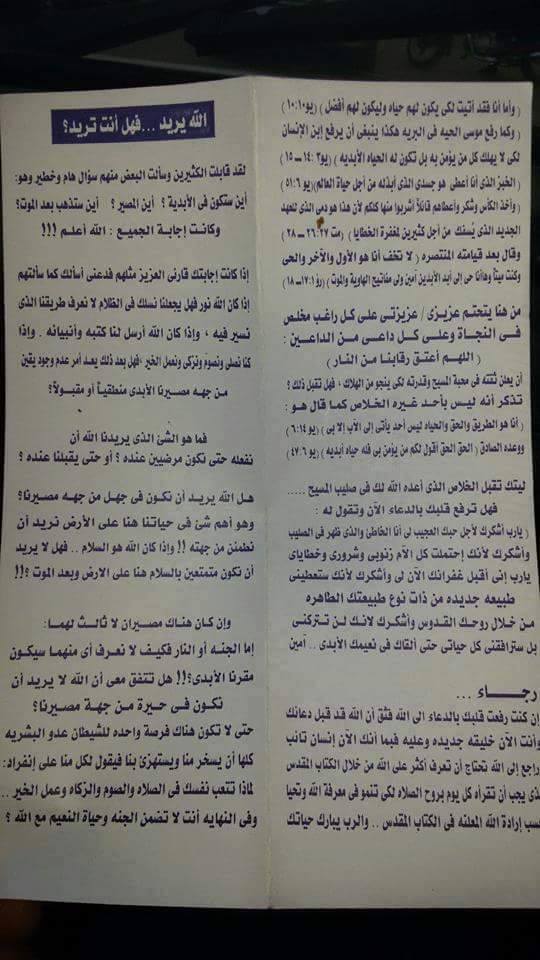 فوجئ أهالي الفيوم، بأشخاص يقومون بتوزيع منشورات على السيارات والمارة بمحافظة الفيوم، وبعد قراءتها وجدوا أنها منشورات تبشيرية تدعو الى المسيحية.