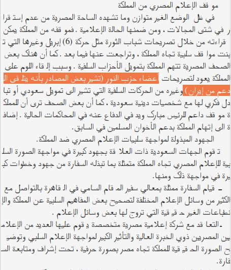 جاء الحديث عن حزب النور في وثائق “ويكليكس” في سياق الكلام عن الإعلام المصري والمملكة العربية السعودية ،والموقف الرافض لبعض القوى الثورية المصرية من دعم المملكة لبعض الشخصيات الدينية المصرية المحسوبة على التيار السلفي.
