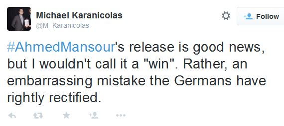 وكتب كارونيكولاس، عبر حسابه الشخصي على موقع “تويتر”: “الإفراج عن أحمد منصور خبر سعيد، لكن لا أسميه انتصارا، بل أسميه تصحيحا لخطأ محرج لألمانيا”.