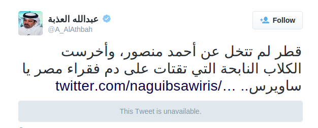 وفي تغريدة له عبر صفحته الرسمية بموقع “تويتر”، كتب فيها: “قطر لم تتخلّ عن أحمد منصور، وأخرست الكلاب النابحة التي تقتات على دم فقراء مصر يا ساويرس”.