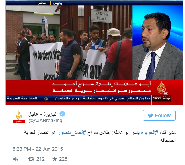 أول المهنئين كان مدير قناة الجزيرة، ياسر أبو هلالة، الذي عبر عن فرحته بقوله: “إطلاق سراح منصور انتصار لحرية الصحافة”.