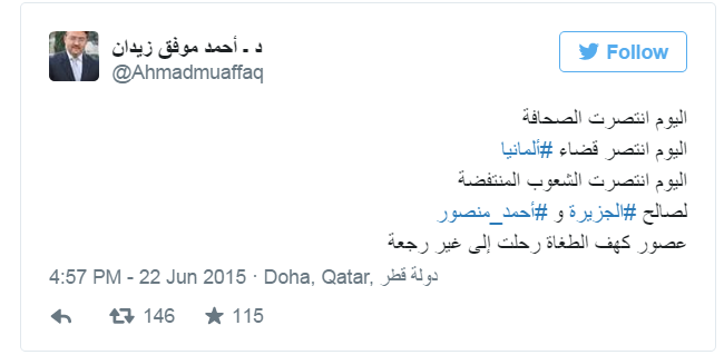 مدير مكتب قناة الجزيرة في باكستان، أحمد موفق زيدان، غرد بقوله: “اليوم انتصرت الصحافة، اليوم انتصر قضاء ألمانيا، اليوم انتصرت الشعوب المنتفضة لصالح الجزيرة وأحمد منصور، عصور كهف الطغاة رحلت إلى غير رجعة”.