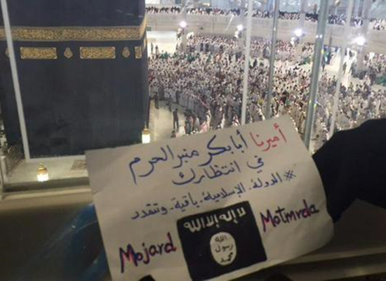 ونشرت المرأة -عبر حسابها- صورة أمام الكعبة المشرفة يظهر فيها ورقة كُتب عليها: “أميرنا أبا بكر، منبر الحرم في انتظارك، الدولة الإسلامية باقية، وتتمدد”، وظهر شعار التنظيم على الورقة.