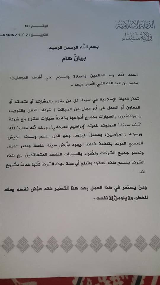 وقالت الدولة الإسلامية التي كانت تسمى “أنصار بيت المقدس” في بيان لها وزعته اليوم على أهالي سيناء، إنها تحذر كل من يقوم بالمشاركة أو التعاقد أو التعاون أو العمل في أي مجال من المجالات “شركات النقل والتوريد والموظفين، والسيارات بجميع أنواعها، وخاصة سيارات النقل” مع شركة أبناء سيناء المملوكة لـ”إبراهيم العرجاني” .