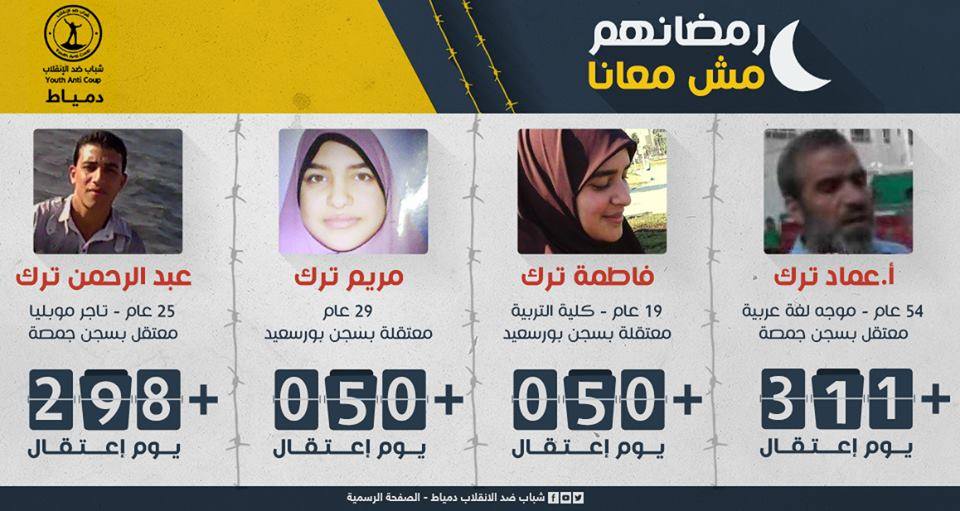 دشنت حركة “شباب ضد الانقلاب” بمحافظة دمياط، حملة بعنوان “رمضانهم مش معانا”؛ للتضامن مع المعتقلين الذين غيبتهم السجون عن ذويهم في شهر رمضان الكريم.