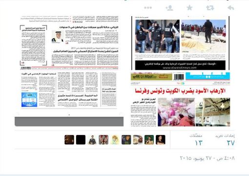 أما جريدة الوسط، فنشرت عنوانًا رئيسيًا قالت فيه “في جمعة الإرهاب.. الدماء تلطخ الكويت وتونس وفرنسا”، وتحدثت الصحيفة باستفاضة عن الهجوم الذي وقع على منتجع سياحي تونسي أدى لمقتل 39 شخصًا، والهجوم على المسجد الكويتي وأيضًا الهجوم على مصنع للغاز في فرنسا.