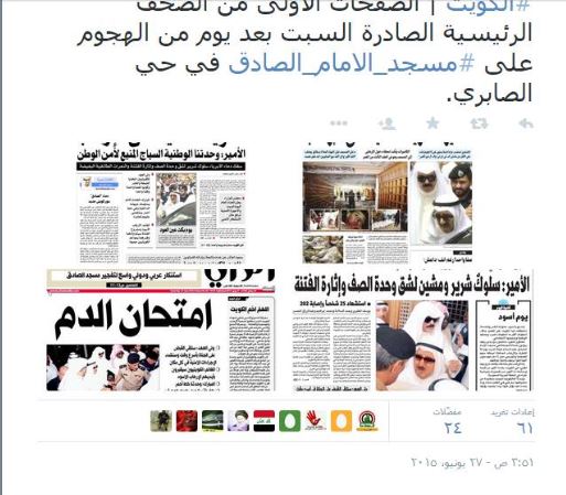 اهتمت الصحف العربية وخصوصًا الخليجية، بالحادث الإرهابي الذي وقع، أمس الجمعة، حين قام عنصر بتفجير نفسه بمسجد الإمام الصادق الشيعي بالكويت، مما أسفر عن وقوع العديد من القتلى والجرحى، وكذلك الحادث الذي وقع بمنتجع مدينة سوسة التونسية وأدى لمقتل 39 شخصًا وإصابة آخرين.