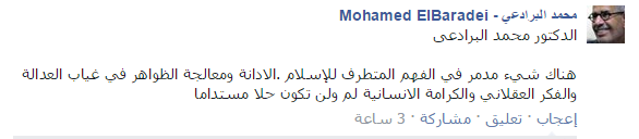علق الدكتور محمد البرادعي، الرئيس الأسبق لوكالة الطاقة الذرية، ومؤسس حزب الدستور، على التفجيرات التي وقعت أمس بتونس والكويت وفرنسا، قائلًا: “هناك شيء مدمر في الفهم المتطرف للإسلام”.
