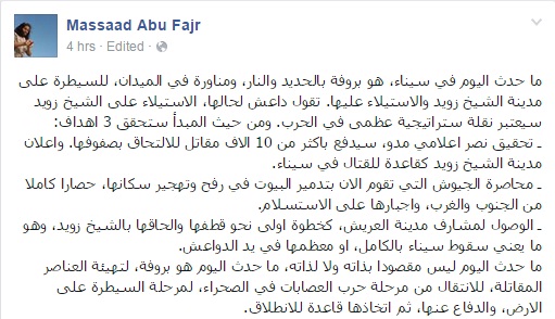 وكتب مسعد أبو فجر في منشور له عبر صفحته الرسمية على موقع “فيس بوك”: “تقول داعش لحالها، الاستيلاء على الشيخ زويد سيعتبر نقلة استراتيجية عظمى في الحرب”.